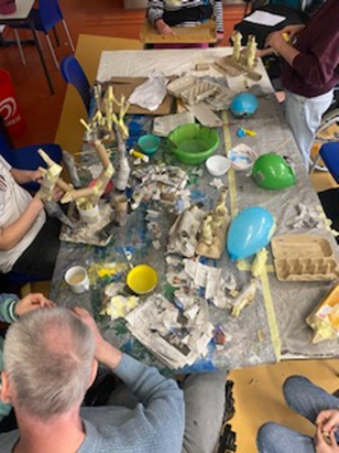 Es entstanden zahlreiche kreative Werke, die am Ende zu einer großen Collage zusammengefügt werden und Teil der Kulisse sein werden. Parallel dazu wurde am Textbuch gearbeitet: Ideen wurden entwickelt, diskutiert und aufgeschrieben.