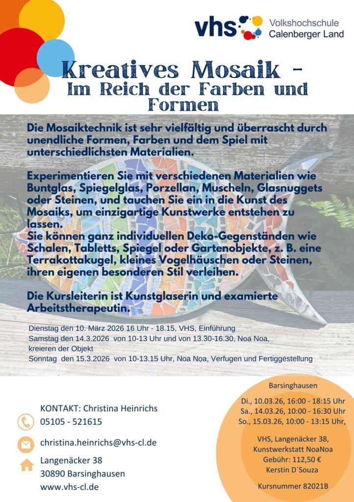 Die Kunstschule Noa Noa startet ganz neu eine kreative Zusammenarbeit mit der VHS Calenberger Land. Gemeinsam entsteht ein inspirierender Mosaikkurs, der künstlerische Freiheit, handwerkliches Können und die Freude am Gestalten verbindet.
